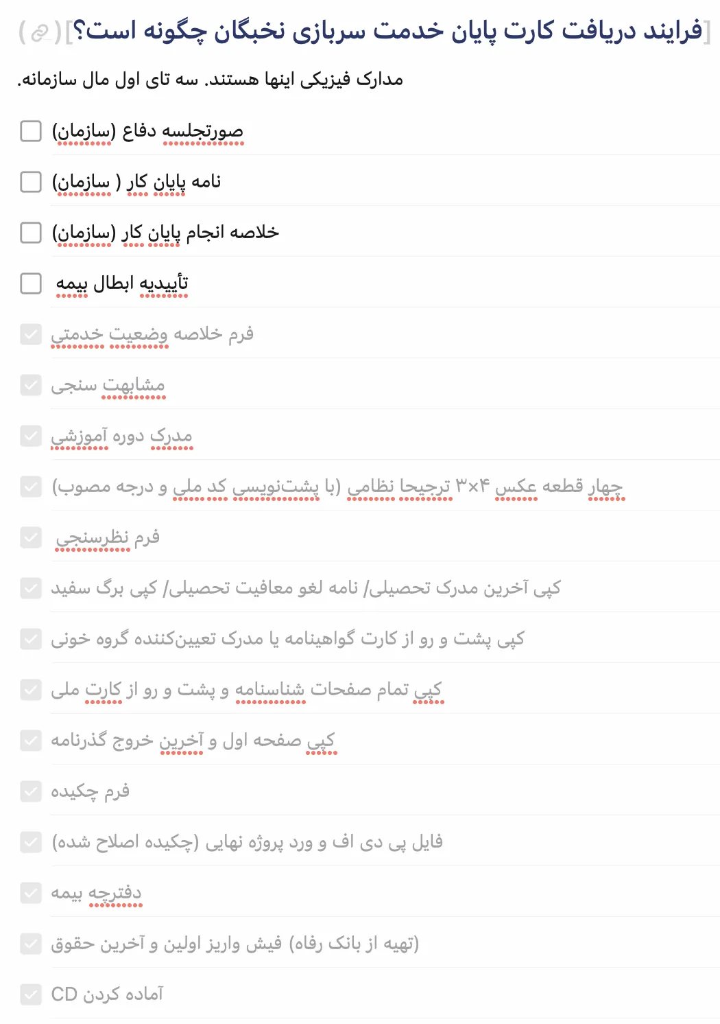 اونهایی که تیک زدم رو شما احتمالاً از یه ماه قبل از این که برید داعا هم بتونید آماده کنید. منظورم بازه زمانیای هست که کارهاتون تموم شده و درگیر امضاهای سربازی هستید.