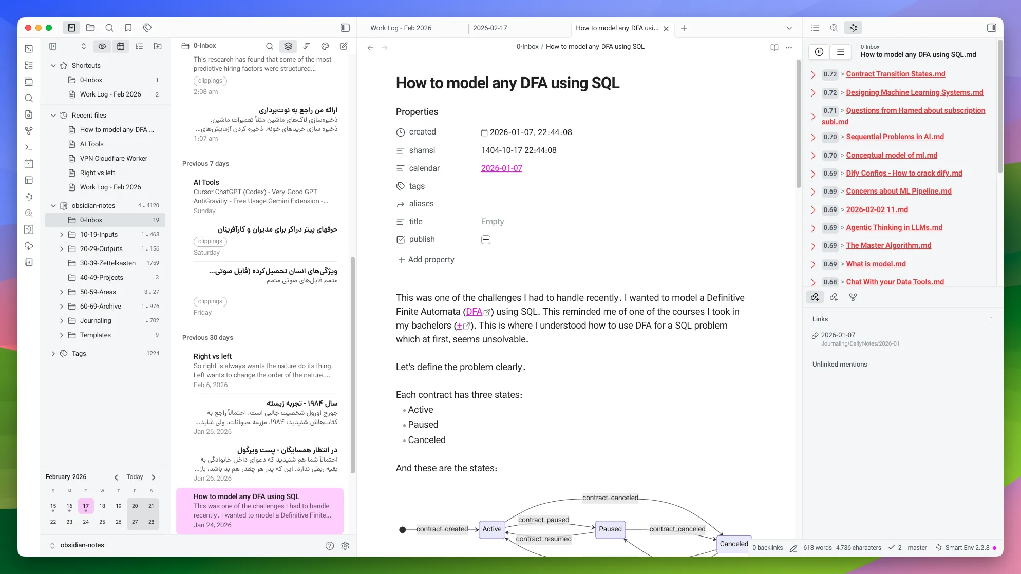چند روز پیش هم پلاگین NoteBook Navigator رو نصب کردم که باعث شد خیلی بهتر بتونم تو ابسیدین کارهام رو جلو ببرم. ظاهر جدید Obsidian من این شکلی شده.